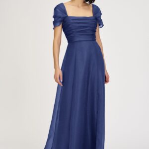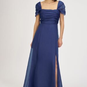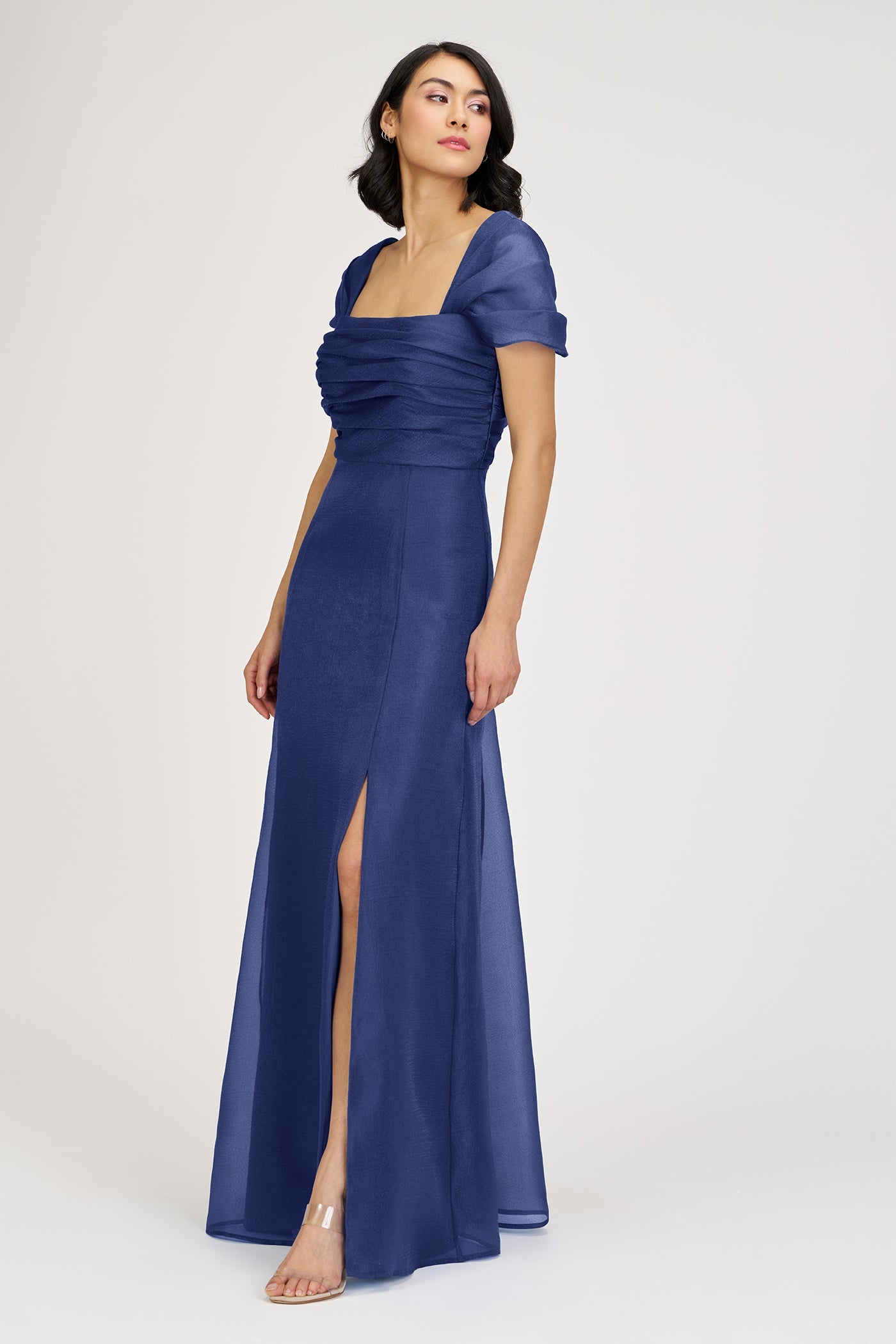 Crafted in textured organza, this gown features soft ruched sleeves and a hand-pleated bodice for subtle structure. A full skirt opens into a thigh-grazing slit—romantic with a little edge. Perfect for evening receptions and cool-weather weddings.
