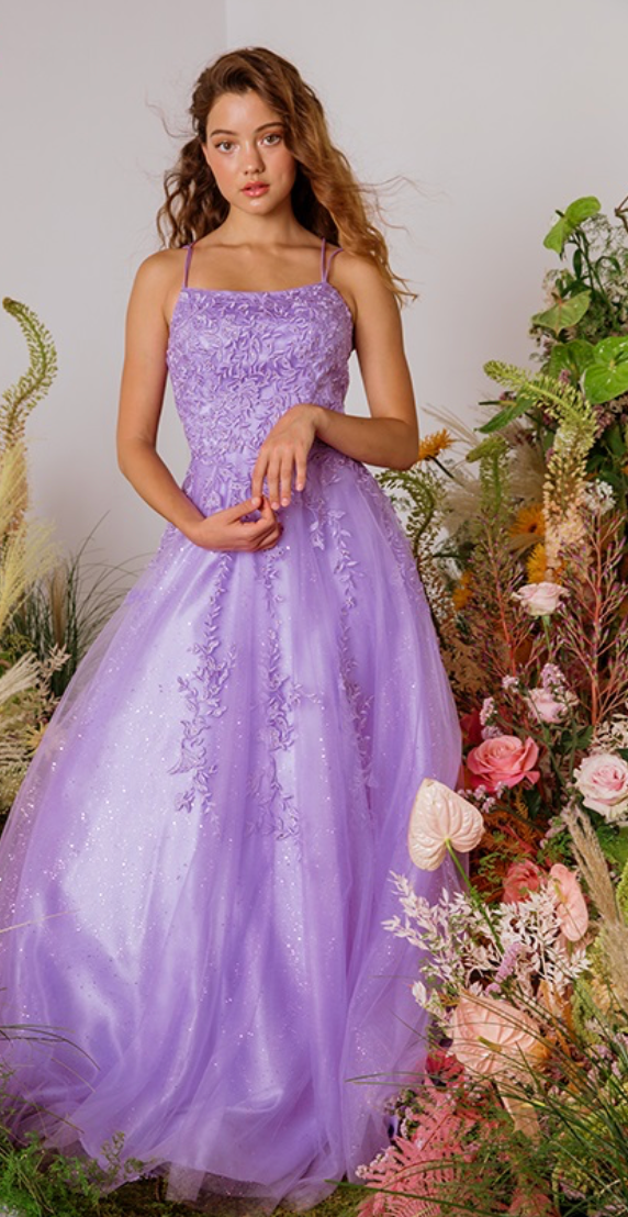 Floor length, A-line silhouette, 3D lace embroidery bodice with boning support, and mesh with glitter shimmer underlay, details with corset back.