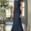 Fit and flare gown with a dramatic bow draped across shoulder accented with crystal beading at waist.