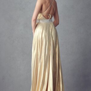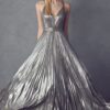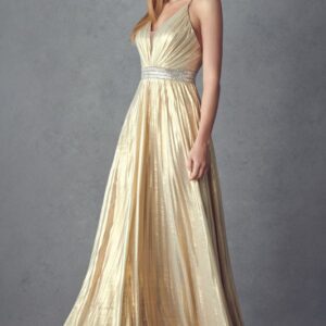 Be red carpet ready in this long sleeveless pleated metallic dress by Juliet. This dress has a illusion v-neck bodice with straps and zipper closure with a sweep train.