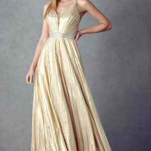 Be red carpet ready in this long sleeveless pleated metallic dress by Juliet. This dress has a illusion v-neck bodice with straps and zipper closure with a sweep train.