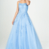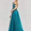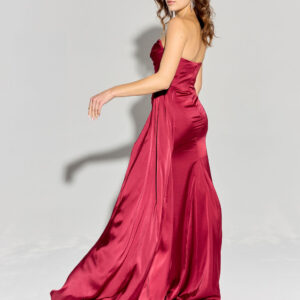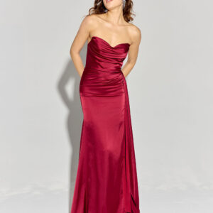 Soft draped, ruched neckline floor length gown with side slit and zipper back.