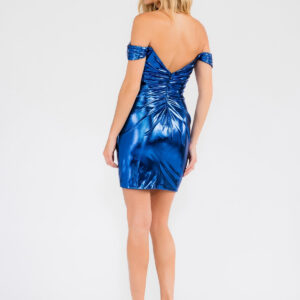 Metallic off shoulder fitted cocktail dress with ruched skirt.