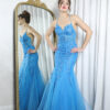 This stunning gown shimmers like starlight. Features a jeweled corset bodice with optional, removable straps. The tiered tulle skirt has shimmery layers and a mid-thigh slit.